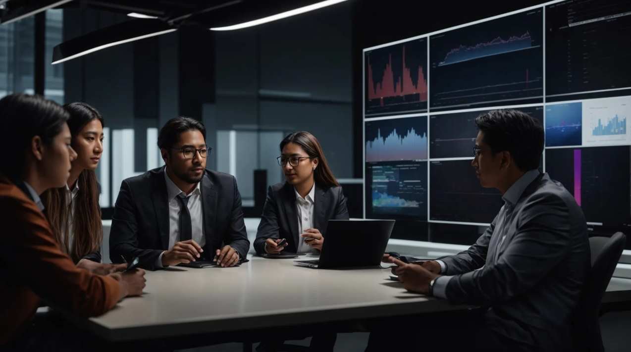 Alt text: Young professionals brainstorming around a table with computer monitors in the background, illustrating how to use knowledge management to foster innovation and teamwork.